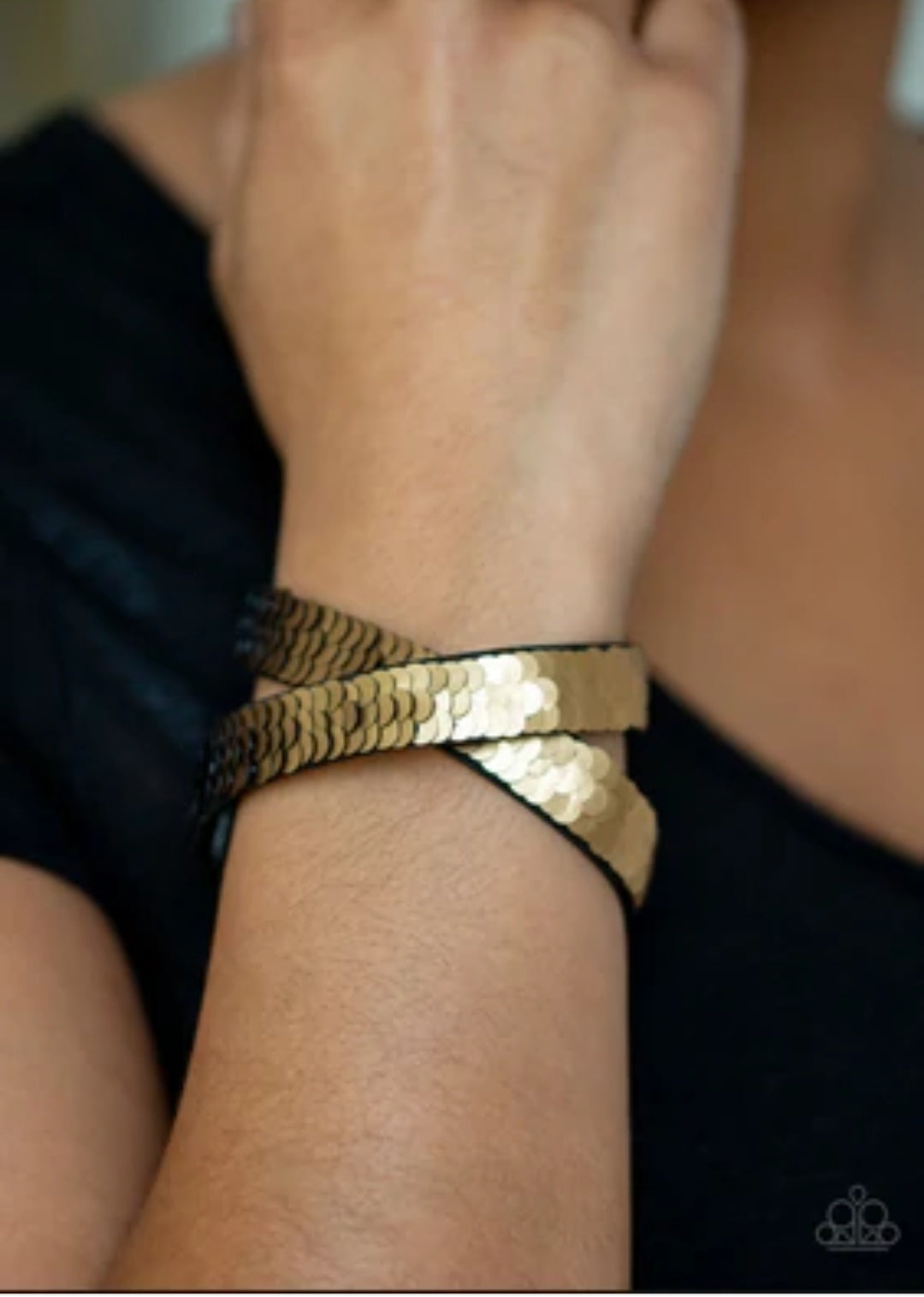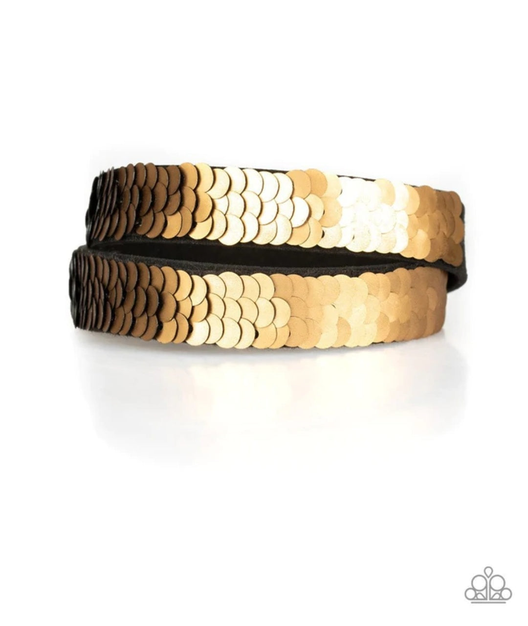 Row after row of shimmery sequins or stitched across the front of a lengthened black suede band. The elongated band allows for a trendy double wrap design. Sold as one bracelet.